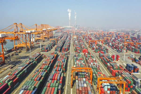 Aerial photo taken on Jan 14, 2021 shows the container terminal of Qinzhou Port in south China's Guangxi Zhuang autonomous region. [Photo/Xinhua] |