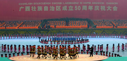 Dressed in bright colorful clothes, the residents of the Guangxi Zhuang autonomous region - a melting pot of ethnic cultures and a booming trade gateway to Southeast Asia - danced and sang to celebrate the region's 50th anniversary on Thursday.