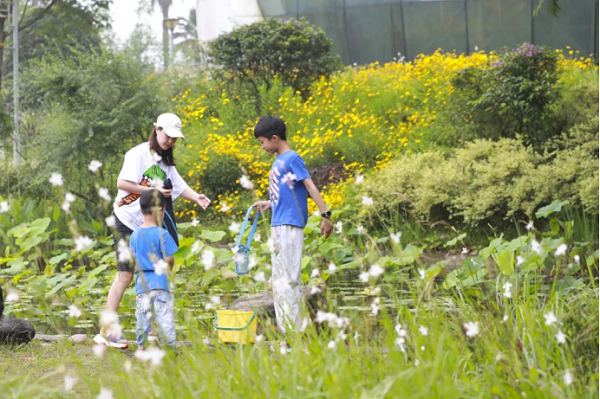 A parent and her two kids are seen playing among the flowers. [Photo/liangjiang.gov.cn] |