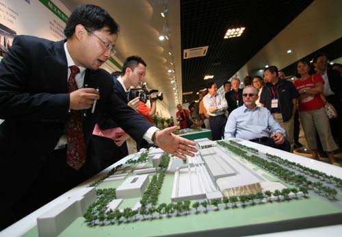 Director of 2008 Project Construction Jin Yan (L) shows a model of a future Olympic facility to members of the International Olympic Committee including its president, Philip Craven (right, seated), in Beijing, May 16, 2006.[Reuters]