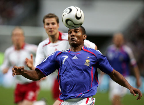 France's Florent Malouda tries to control the ball in front of
