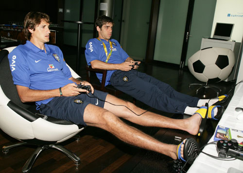 Brazil's Edmilson (L) plays video games with teammate Juninho