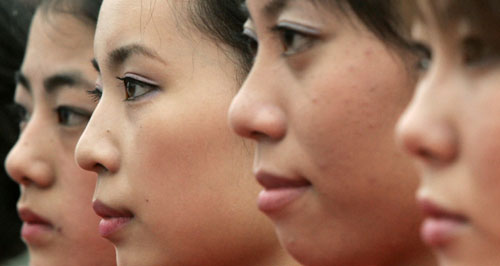 Usherettes wait for the launch of "Beijing: An Olympic City Photo Contest 2006" at the Temple of Heaven in Beijing June 2, 2006. Organisers of the 2008 Games, concerned at ignorance of the Olympics in a country which returned to the movement only 22 years ago, have rolled out the programme to 530,000 schools across the country over the last year or so. China views the 2008 Games as its coming-out party to the world. [Reuters]