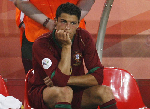 Portugal's Cristiano Ronaldo sits on the bench after he was substituted during the Group D World Cup 2006 soccer match against Angola in Cologne June 11, 2006.[Reuters]