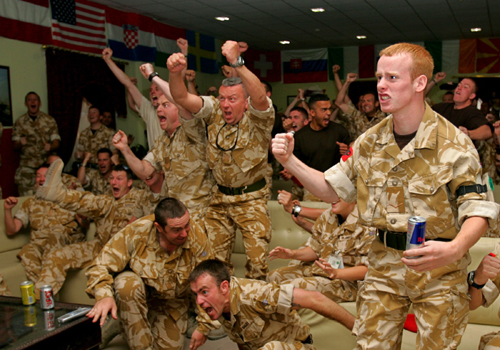 British soldiers from the NATO-led international peacekeepers cheer as they watch the England team score a goal against Paraguay during their World Cup 2006 soccer match, screened on a projector, in Kabul June 10, 2006. [Reuters]