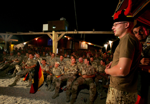 German soldiers from the NATO-led international peacekeepers wait to watch the opening soccer match of the World Cup on television in Kabul June 9, 2006. [Reuters]