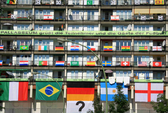 National flags, some of nations competing in the soccer World Cup 2006, adorn a residential apartment block in Berlin June 12, 2006. [Reuters]