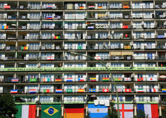 National flags, some of nations competing in the soccer World Cup 2006, adorn a residential apartment block in Berlin June 12, 2006. [Reuters]