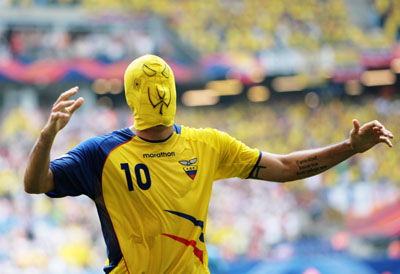 Ecuador's Ivan Kaviedes celebrates scoring his team's third goal against Costa Rica during their Group A World Cup 2006 soccer match in Hamburg June 15, 2006. [Reuters]