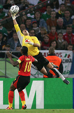 (top) makes a save near team mate Akwa during their Group D World Cup 2006