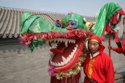 A performer carries a dragon on the Chinese Wall at Badaling during a ceremony to start the fourth Beijing Olympic arts festival June 23, 2006. [Reuters]