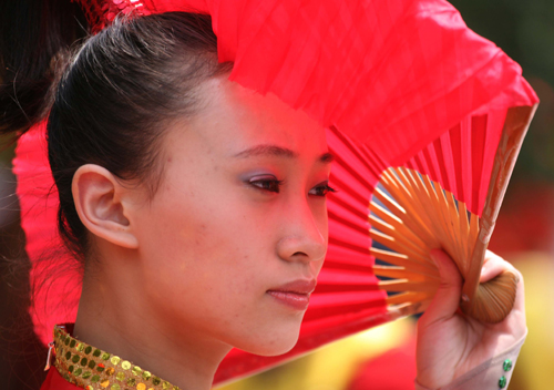 A performer holds a fan during a ceremony to start the fourth Beijing Olympic arts festival near the Chinese Wall at Badaling June 23, 2006. [Reuters]