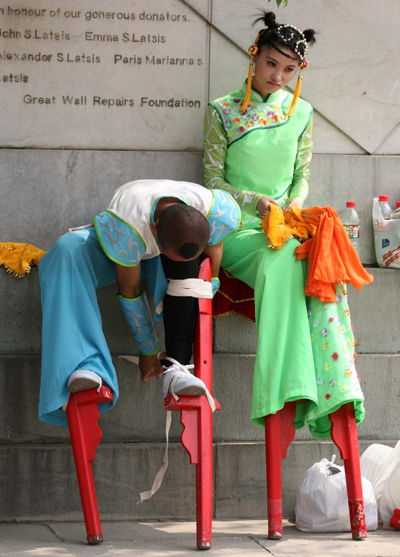 Stilt performers prepare themselves during a ceremony to start the fourth Beijing Olympic arts festival near the Chinese Wall at Badaling June 23, 2006. [Reuters]