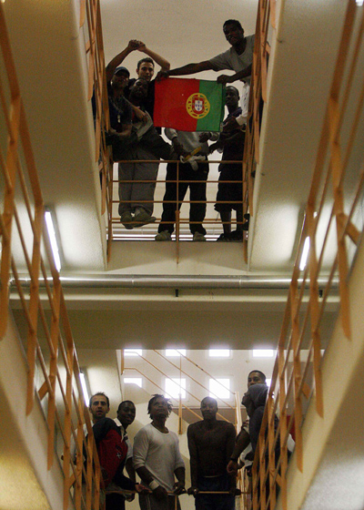Prisoners hold their national flag before the World Cup 2006 soccer match