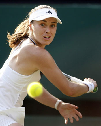 Switzerland's Martina Hingis plays a shot to Japan's Ai Sugiyama during their match at the Wimbledon tennis championships in London June 30, 2006. [Reuters]