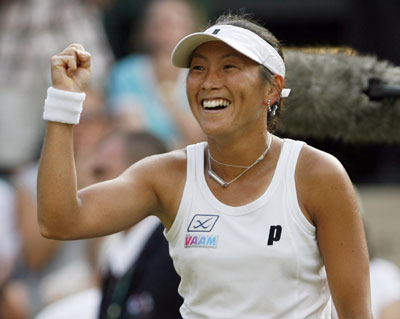 Japan's Ai Sugiyama celebrates winning her match against Switzerland's Martina Hingis at the Wimbledon tennis championships in London June 30, 2006. [Reuters]
