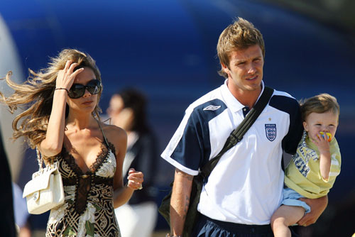 England's former captain David Beckham (C) arrives from Germany