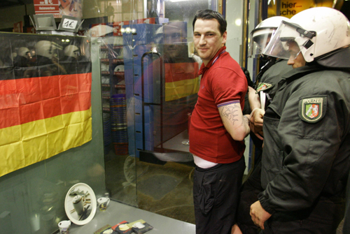 Riot police detain a soccer fan after clashes following the World Cup 2006 soccer quarter final match England against Portugal in the centre of Gelsenkirchen, Germany, July 1, 2006. [Reuters]