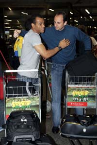 captain Cafu (L) embraces goalkeeper Rogerio Ceni as they arrive at the