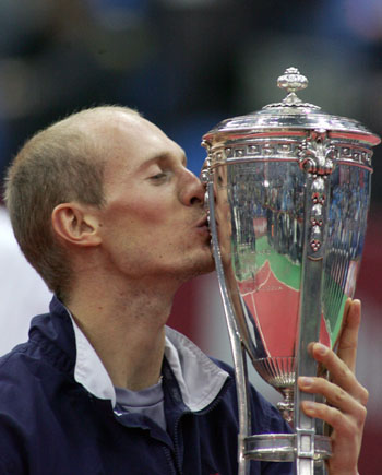 Russia's Nikolay Davydenko kisses his trophy after winning the Kremlin Cup final tennis match against compatriot Marat Safin in Moscow October 15, 2006. [Reuters]