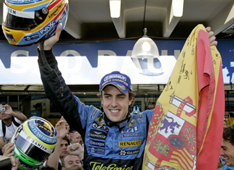Alonso of Spain celebrates with the Renault team after finishing second in