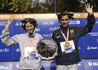 Athletics-Brazil's Gomes, Prokopcuka win NYC Marathon(Reuters)Updated: 2006-11-06 08:40 NEW YORK, Nov 5 - Marilson Gomes dos Santos of Brazil became the first South American to win the New York City Marathon while Latvia's Jelena Prokopcuka retained her women's title with a commanding performance on Sunday.