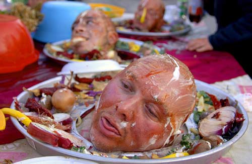 heads on plates perform a pagan ritual in the village of Vevcani, some 170