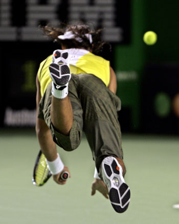 Spain's Rafael Nadal jumps for the ball during his match against Andy Murray of Britain at the Australian Open tennis tournament in Melbourne January 22, 2007. [Reuters]