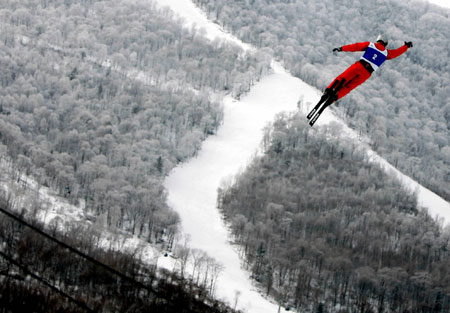 Olympic champion Han crowned at Asiad(Xinhua)Updated: 2007-02-01 16:14 China's Han Xiaopeng flies over the forest near Beidahu Ski Resort during the competition of the men's aerials at the 6th Winter Asian Games February 1, 2007. Han won the gold and teammate Qiu Sen took the silver. [Xinhua]