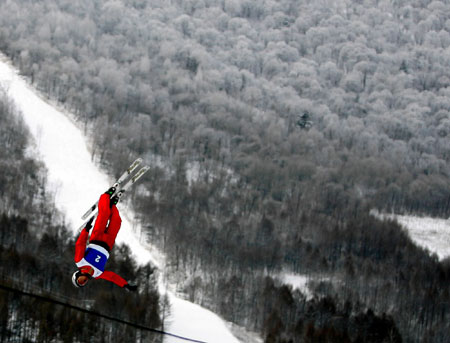 China's Han Xiaopeng flies over the forest near Beidahu Ski Resort during the competition of the men's aerials at the 6th Winter Asian Games February 1, 2007. Han won the gold and teammate Qiu Sen took the silver. [Xinhua]
