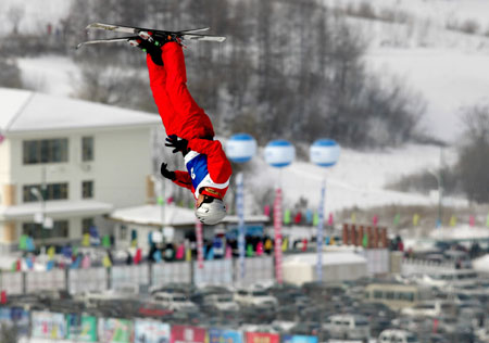 Han Xiaopeng competes in men's aerials at the 6th Winter Asian Games February 1, 2007. Han won the gold and teammate Qiu Sen took the silver. [Xinhua]