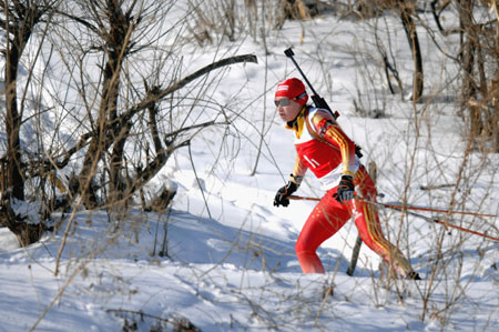 China's Kong Yingchao competes in the women's 4x6km biathlon relay at the 6th Winter Asian Games February 2, 2007. The Chinese squad teamed up by Dong Xue, Liu Xianying, Kong Yingchao and Yin Qiao won the gold 1:29:03.1. [Xinhua]