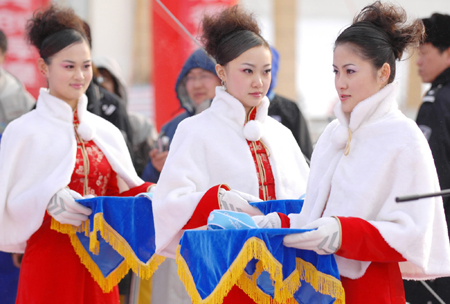 Pretty tray bearers of 6th Asian Winter Games servie for the medal ceremony service in Changchun,northeast China's Jilin Province, Feb.2,2007.[Xinhua]\