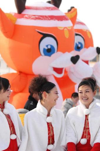 Pretty tray bearers of 6th Asian Winter Games talk with each others