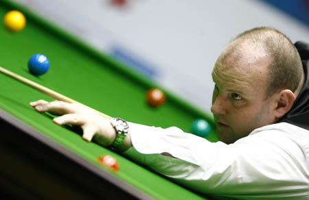Adrian Gunnell prepares to hit a shot aganist Ding Junhui from China during the first round of Snooker China Open. Ding ousts Adrian Gunnell 5-3 to advance the next round Mar 26,2007.[Xinhua]