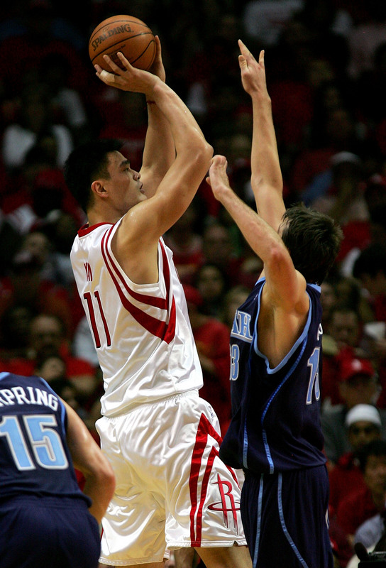 Yao Ming (L) of the Houston Rockets puts up a shot against Mehmet Okur (R) of the Utah Jazz in Game One of the Western Conference Quarterfinals during the 2007 NBA Playoffs at the Toyota Center 21 April in Houston, Texas. The Rockets won 84-75. [AP] |