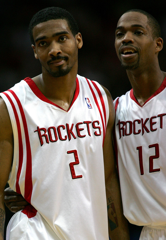 Luther Head #2 and Rafer Alston #12 of the Houston Rockets share a moment after a foul committed by the Utah Jazz late in the fourth period in Game One of the Western Conference Quarterfinals during the 2007 NBA Playoffs at the Toyota Center April 21, 2007 in Houston, Texas. [AP] |