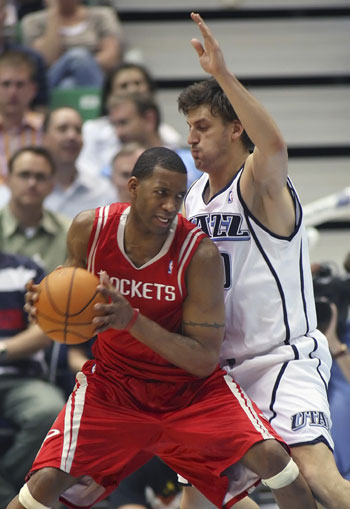 Jazz cruise past Rockets to square series(Reuters)Updated: 2007-04-29 13:25 Houston Rockets forward Tracy McGrady (1) tries to go around Utah Jazz guard Gordan Giricek (10) of Croatia during second quarter of Game 4 between Utah Jazz and Houston Rockets in the NBA Western Conference Playoffs in Salt Lake City, Utah, April 28, 2007. Yao Ming scored 20 points and grabbed 8 rebounds. [Reuters] |