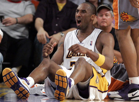 Los Angeles Lakers Kobe Bryant protests a foul against the Phoenix Suns during Game 4 of their Western Conference NBA men's basketball quarterfinal playoff series in Los Angeles, April 29, 2007. [Reuters]