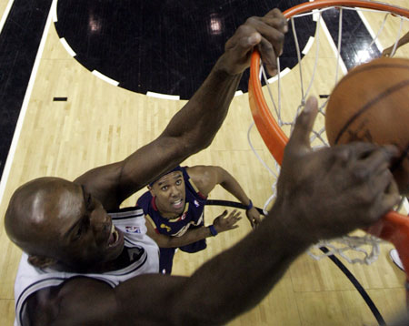 San Antonio Spurs' Francisco Elson (L) dunks over Cleveland Cavaliers' Daniel Gibson in the first quarter during Game 2 of the NBA Finals basketball series in San Antonio, Texas, June 10, 2007. Spurs took a 2-0 lead with a 103-92 win. [Reuters]