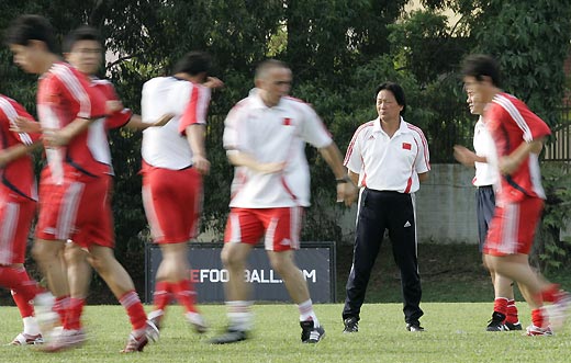 | China's soccer team coach Zhu Guanghu (2nd R) watches his