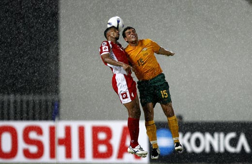 Australia's John Aloisi (R) challenges Oman's Said Suwailim in the air during their 2007 AFC Asian Cup Group A soccer match at Rajamangala Stadium in Bangkok July 8, 2007. [Reuters]