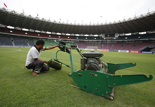 | A worker repairs a grass roller at Gelora Bung Karno stadium in