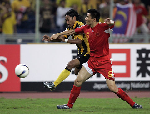 Malaysia's Eddy Helmi (L) is stopped by China's Li Weifeng during their 2007 AFC Asian Cup Group C soccer match in Kuala Lumpur July 10, 2007. [Reuters]