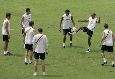 Australia's national soccer team player Archie Thompson (11) plays the ball as Timothy Cahill (4) and Archie Thompson (R) look on during a team practice session at the 2007 AFC Asian Cup tournament Bangkok on July 12, 2007. Australia plays Iraq in a Group A match on Friday. [Reuters]