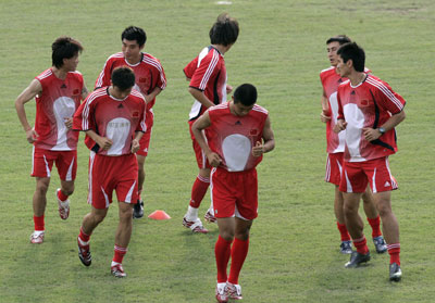 China's soccer players warm up during a training session for the 2007 AFC Asian Cup soccer tournament in Kuala Lumpur July 12, 2007. [Reuters]