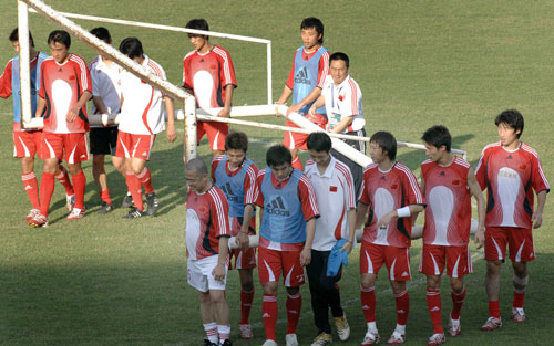 Chinese footballers at training before last group game(Xinhua)Updated: 2007-07-17 09:20 Chinese national footballers carry a soccer goal during the training session before their last game of the first round against Uzbekistan of the ongoing Asian Cup football tournament in Kuala Lumpur of Malaysia July 16, 2007. The game will kick off on Wednesday. [Xinhua]