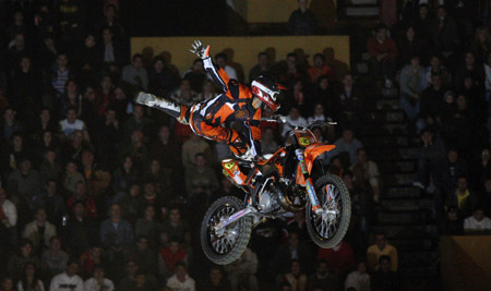 Spanish competitor Jose Miralles performs a jump during a freestyle motocross show in the Burgos bullring July 21, 2007. [Reuters]