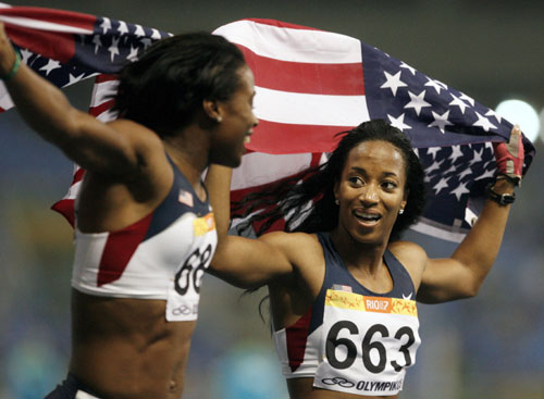 Gold medallist Mikele Barber (R) of U.S. celebrates with her compatriot, silver medallist Mechelle Lewis at women 100m finals at the Pan American Games in Rio de Janeiro July 24, 2007. [Reuters]