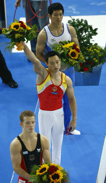 Gold medallist Yang Wei of China (C), silver medallist Fabian Hambuechen of Germany (front), and Japan's bronze medallist Hisashi Mizutori listen to the national anthem of China during the flower ceremony for the men's individual all-around final at the 40th World Artistic Gymnastics Championships in Stuttgart September 7, 2007. [Reuters] |
